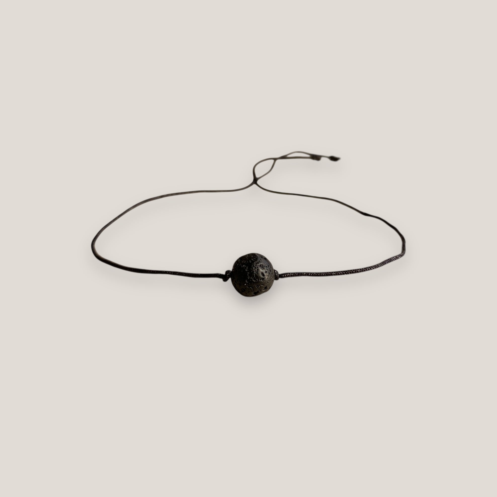 Collar mini Dafne perlas lava negra, rondeles gunmetal con cristalitos blancos