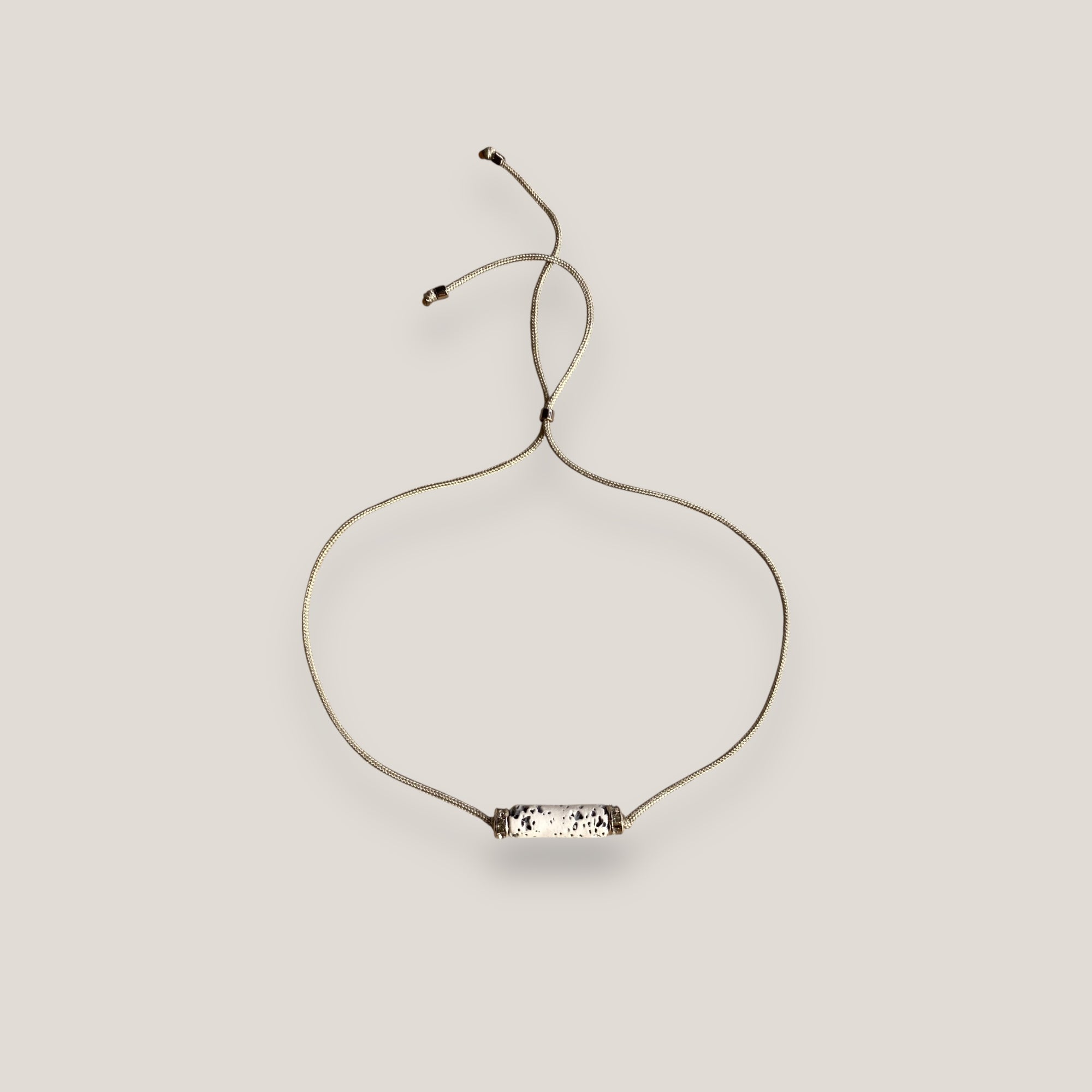 Pulsera minimal con medallita tribal plateada, doce bolitas de lava blanca y brillis