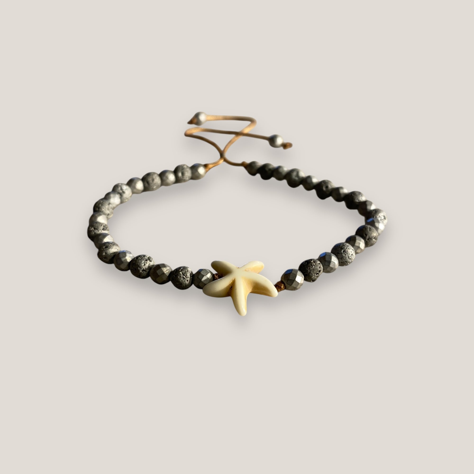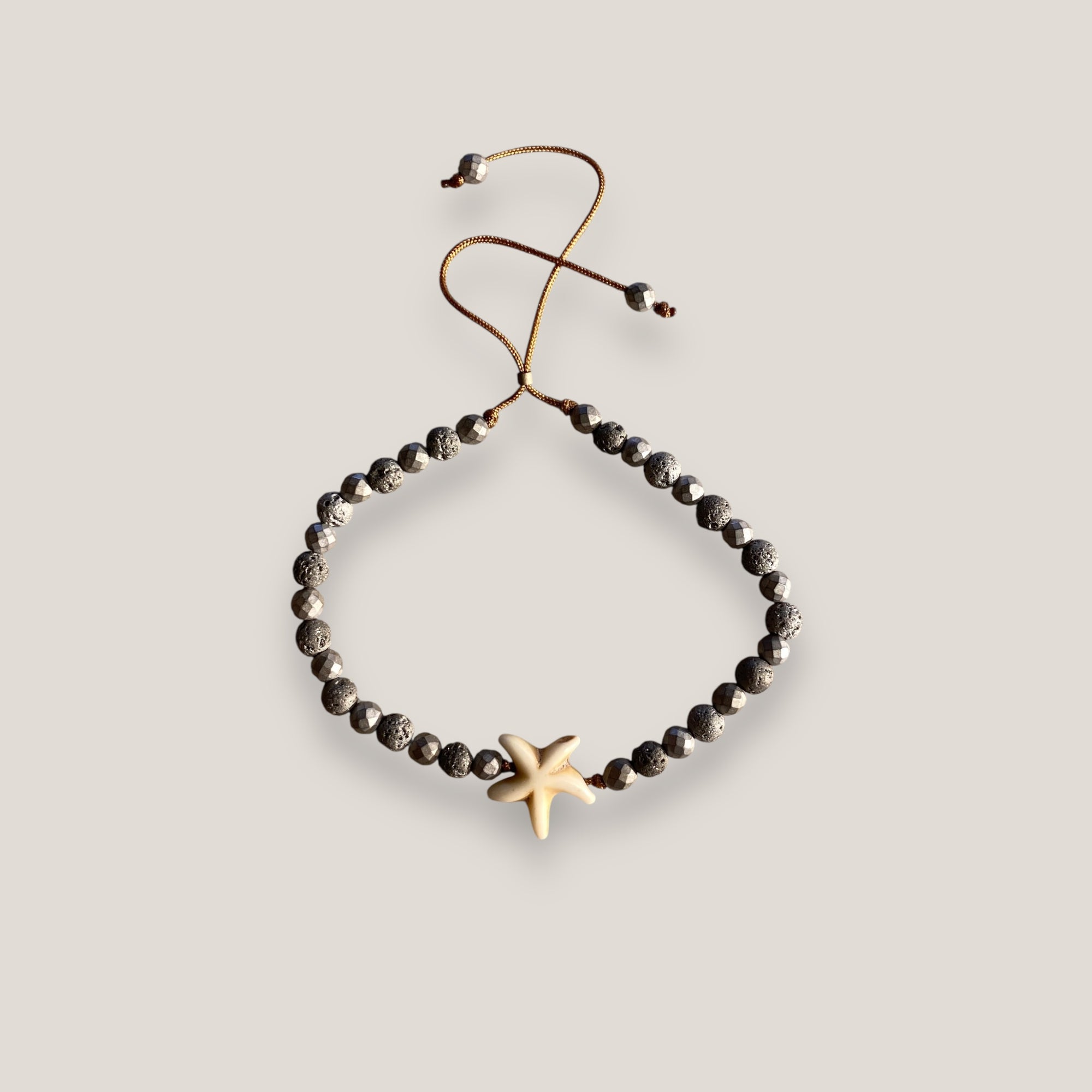 Pulsera Eloise con estrella howlita blanca, lava y hematitas facetadas gris metalizadas