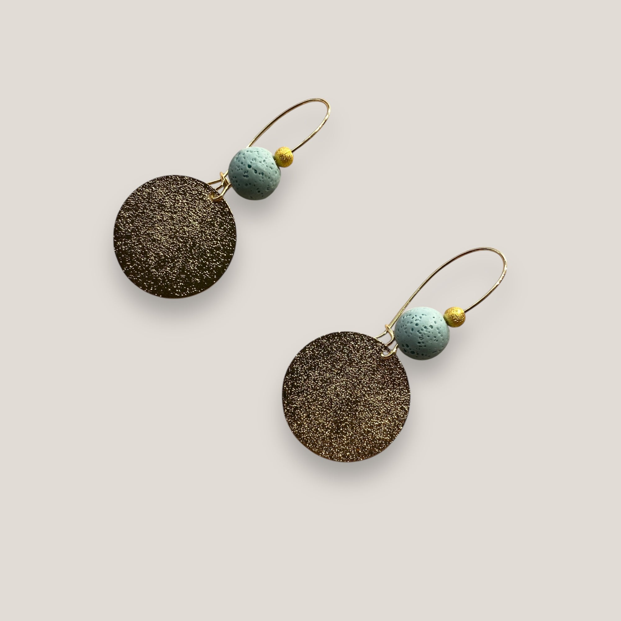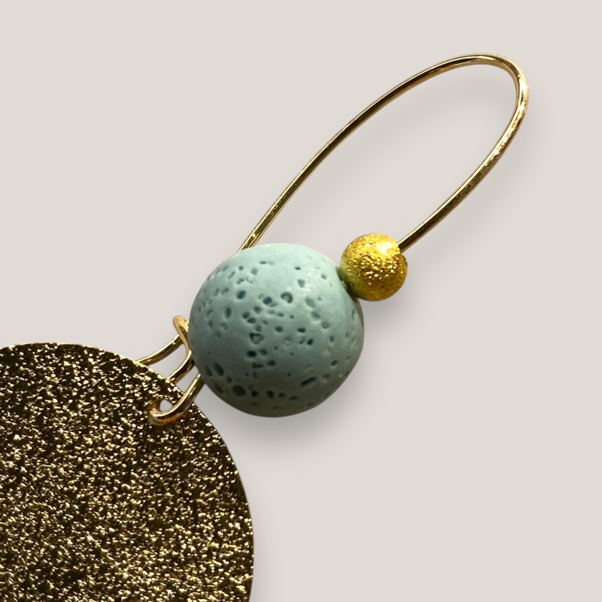 Pendientes Fuerte Beads con gancho y medalla martilleada dorados, bola 10mm esponja coral verde turquesa y bola 4mm dorada esmerilada