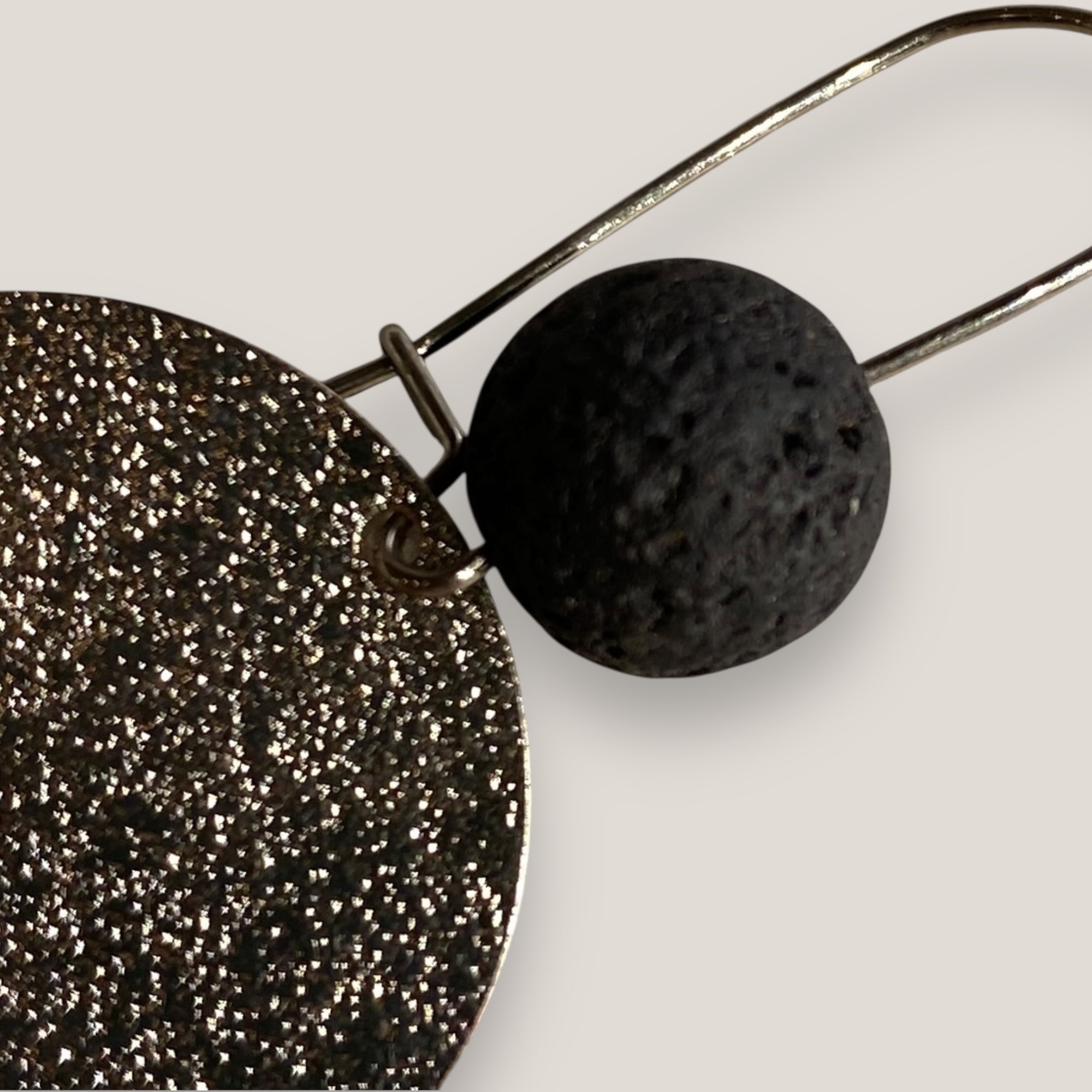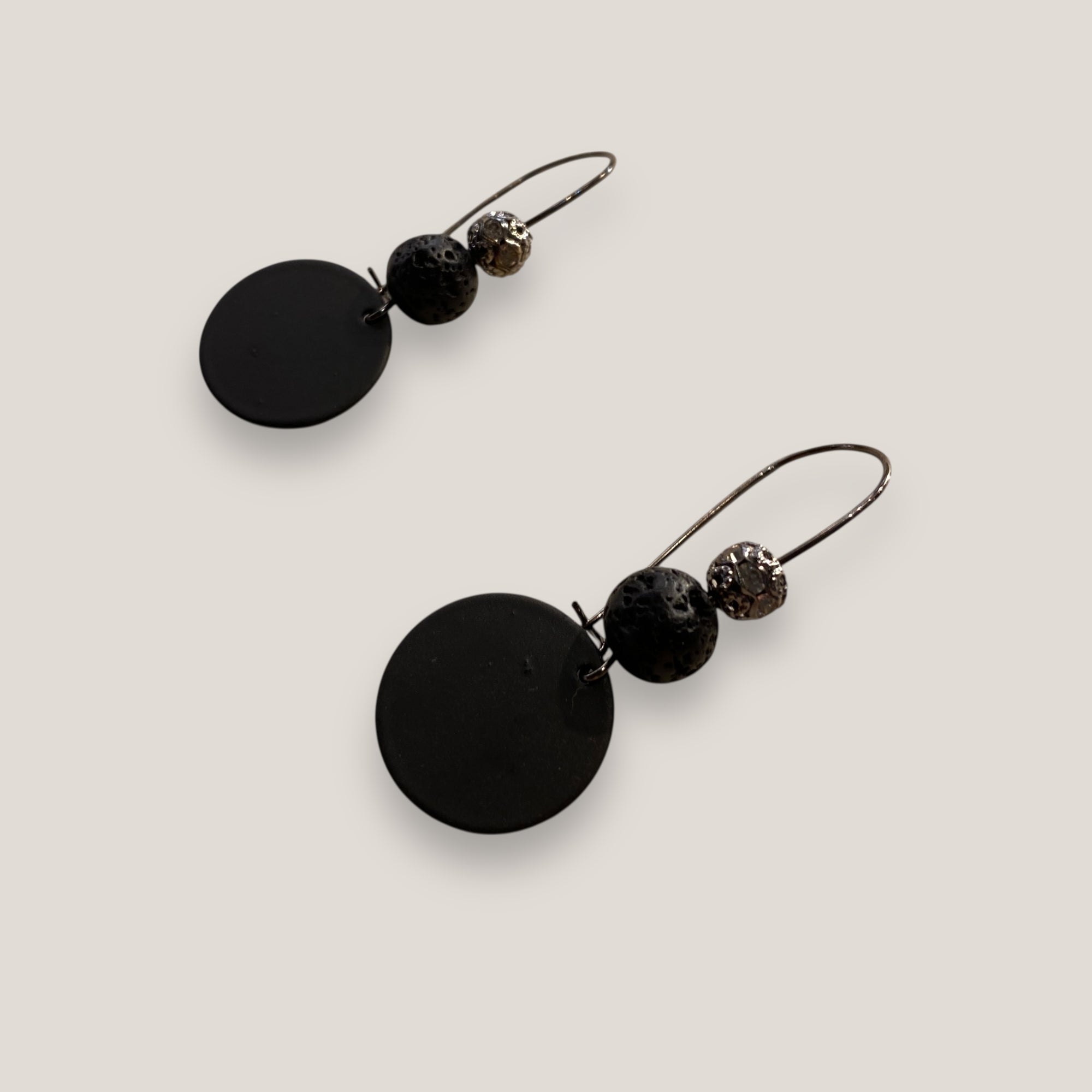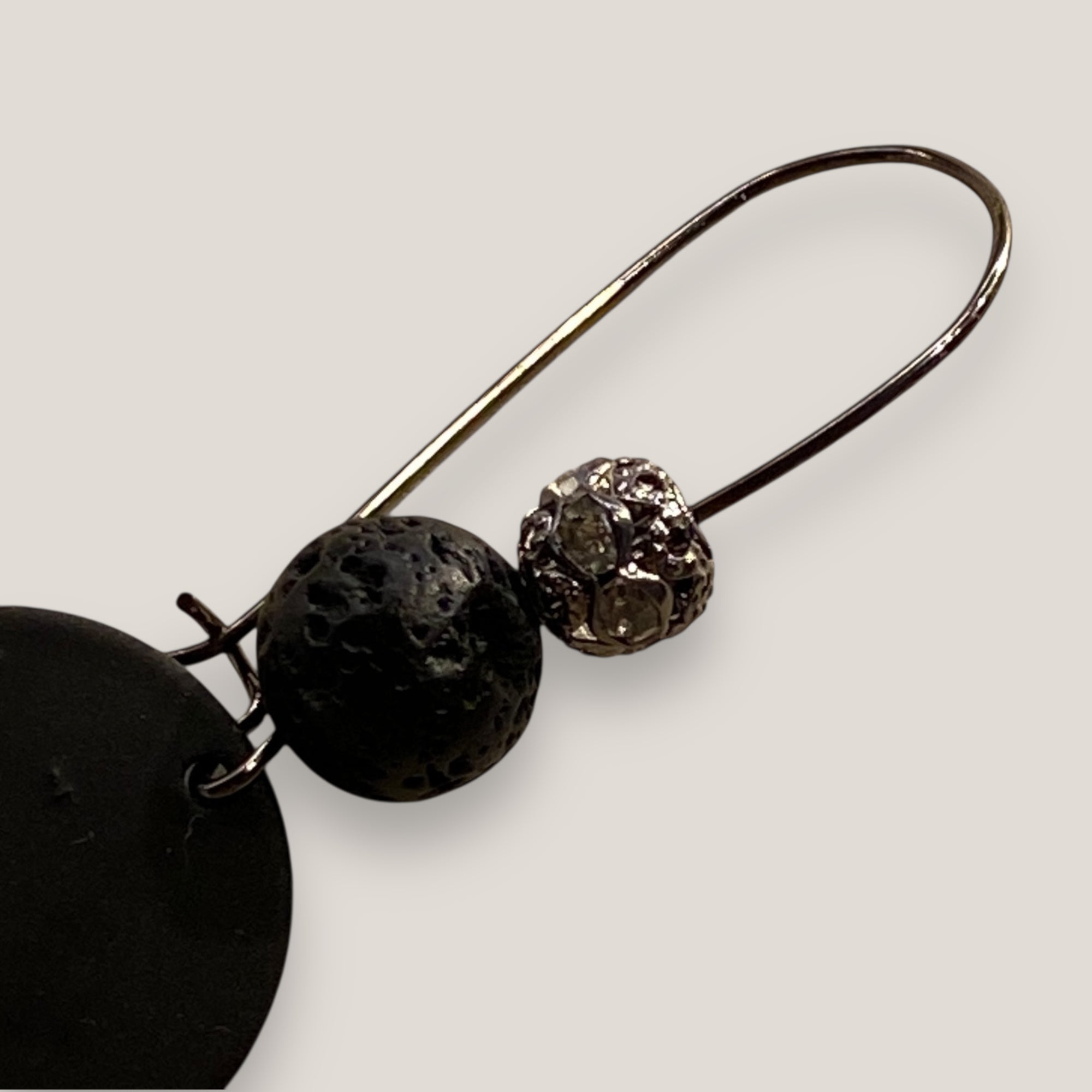 Pendientes Dafne gancho gunmetal con medalla negra mate, lava negra y filigrana con cristalitos