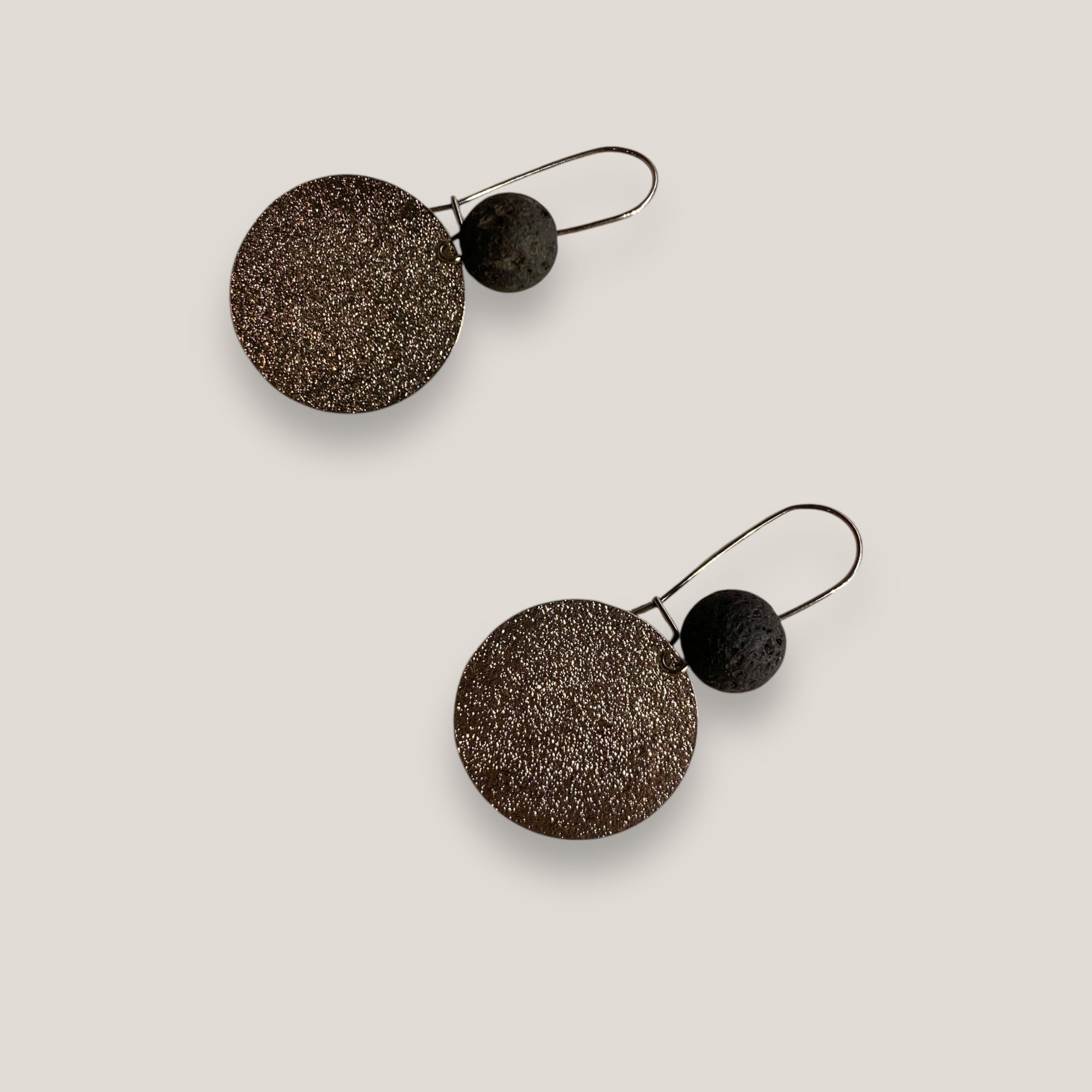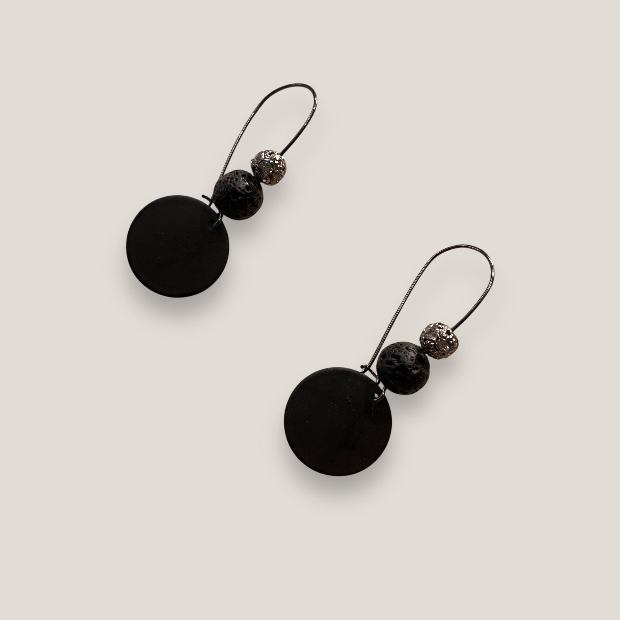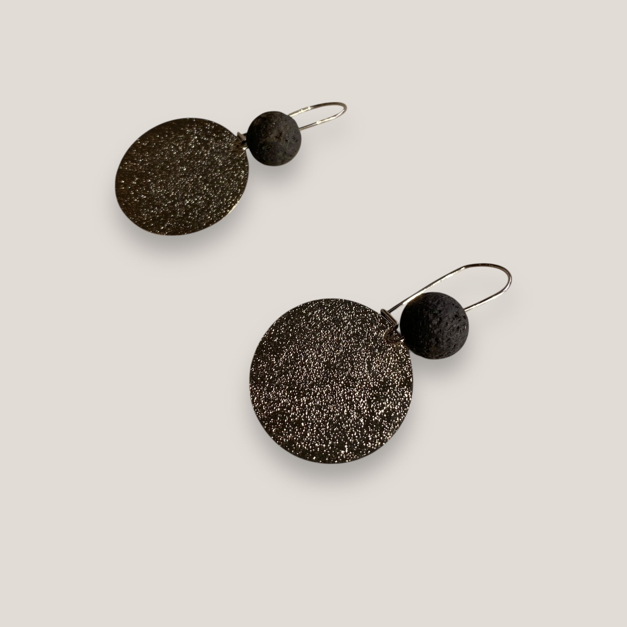 Pendientes Dafne gancho gunmetal con medalla negra mate, lava negra y filigrana con cristalitos