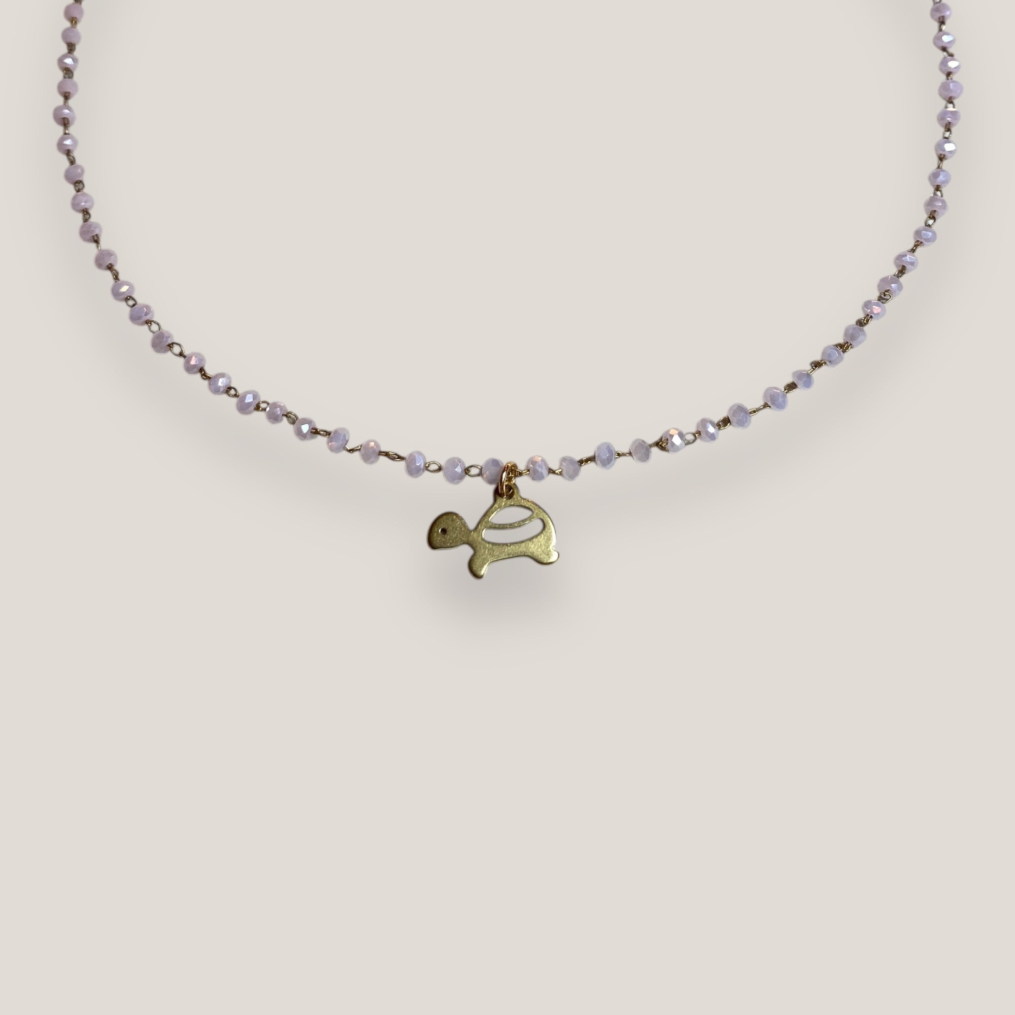 Collar cadena con cristales facetados rosa engarzados con medallita de tortuga acero oro